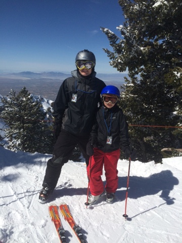 Beautiful day at the Basin yesterday! Keat and I did some skiing while Jonas had his first snowboard lesson. Keat was determined to beat Jonas' record of 38mph and it wasn't easy! The first few runs he topped out at 35 and couldn't believe Jonas hit that speed. 38 is fast! Then we took another trip to the top of the Olympic downhill track. Keat kept asking if he could just bomb the whole thing! I made him get on his edges and carve about half way down the first shoot before he let it fly. That kid hit 53 mph!